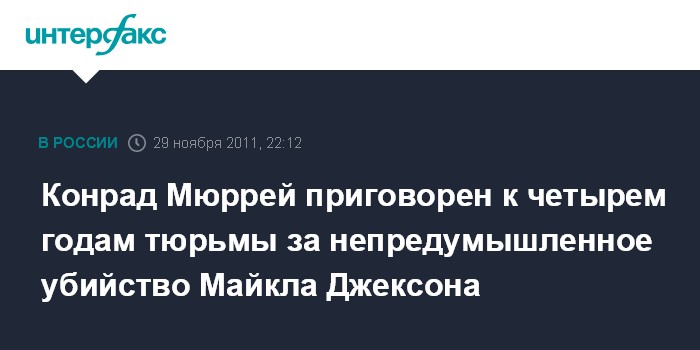 Лондон. 29 ноября. INTERFAX.RU - Суд США приговорил врача поп-идола Майкла Джексона Конрада Мюррея к четырем годам тюремного заключения за непредумышленное убийство певца, сообщает в о вторник британская BBC.