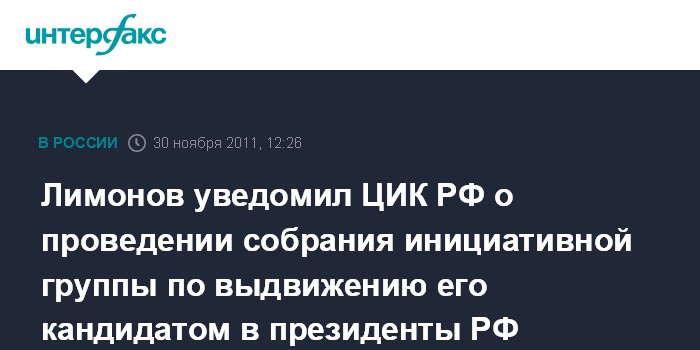 "Эдуард Лимонов примерно час назад лично подал уведомление в ЦИК РФ, согласно процедуре закона, о том, что 11 декабря в Гостиничном комплексе "Измайлово" состоится собрание инициативной группы граждан по выдвижению его кандидатом в президенты РФ", - сообщил "Интерфаксу" в среду член исполкома незарегистрированной партии "Другая Россия" Сергей Аксенов.