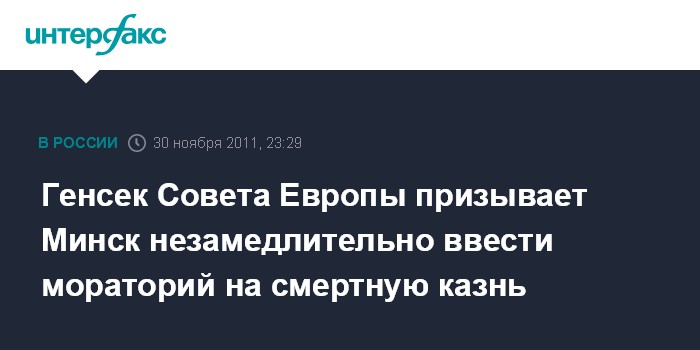 Страсбург. 30 ноября. INTERFAX.RU - Генеральный секретарь Совета Европы Торбьерн Ягланд в среду обратился к белорусским властям с призывом не исполнять смертные приговоры лицам, признанным виновными в реализации теракта в минском метро в апреле этого года.