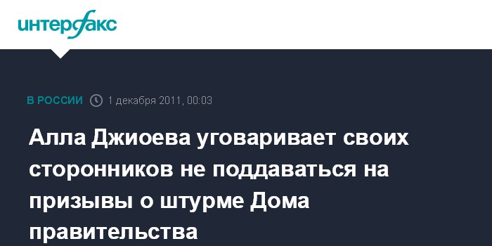 Цхинвали. 1 декабря. INTERFAX.RU - Экс-кандидат в президенты Южной Осетии от оппозиции Алла Джиоева призывает собравшихся на площади перед Домом правительства сторонников в Цхинвали не поддаваться на призывы о штурме здания.