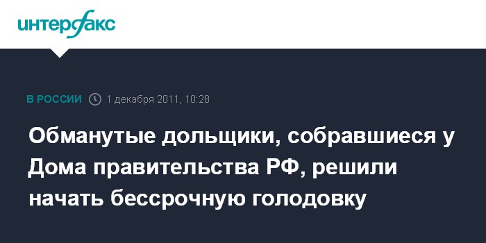 Москва. 1 декабря. INTERFAX.RU - Группа обманутых дольщиков, которая проводит несанкционированную акцию в центре Москвы, объявила бессрочную голодовку, сообщил "Интерфаксу" координатор движения "Однодольщики" Игорь Гульев.