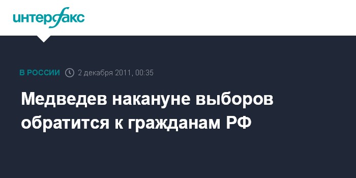 Москва. 2 декабря. ИНТЕРФАКС - Президент РФ Дмитрий Медведев в пятницу выступит с обращением к гражданам страны, посвященным предстоящим выборам в Государственную думу, сообщила пресс-секретарь президента Наталья Тимакова.