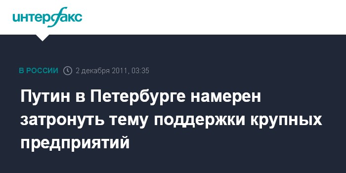 Москва. 2 декабря. ИНТЕРФАКС - Премьер РФ Владимир Путин в пятницу посетит Петербург, где обсудит вопросы поддержки и сохранения ряда крупных предприятий города, в частности, оборонных.