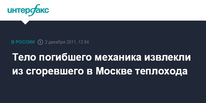 Москва. 2 декабря. INTERFAX.RU - Тело механика-моториста со сгоревшего в Москве теплохода "Сергей Абрамов" извлечено на поверхность только в пятницу, погибший опознан, сообщил "Интерфаксу" источник в правоохранительных органах.