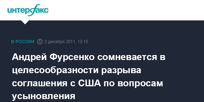 "Сейчас необходимо разобраться, в какой степени новый документ гарантирует, что подобные инциденты с российскими детьми не повторятся. Если такие гарантии в соглашении заложены, приостанавливать или разрывать его не следует", - отметил Фурсенко.