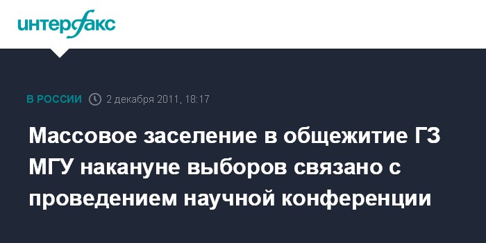 Москва. 2 декабря. INTERFAX.RU – Массовое заселение молодых людей в общежитие Главного здания МГУ накануне выборов формально связано с проведением 2-8 декабря конференции "Гуманитарные аспекты обеспечения стабильности и сотрудничества в регионе ШОС", организованной факультетом глобальных процессов.