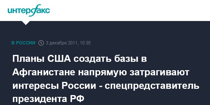 Москва. 3 декабря. INTERFAX.RU - Намерение США создать в Афганистане военные базы после вывода международных сил вызывает у России большие вопросы, заявил спецпредставитель президента РФ по Афганистану Замир Кабулов. "Что нам действительно непонятно - как планы по сокращению численности американских войск сочетаются с укреплением Вашингтоном своей военной инфраструктуры в Исламской Республике Афганистан, подразумевающим, в том числе, создание там военных баз", - сказал он в интервью "Интерфаксу".