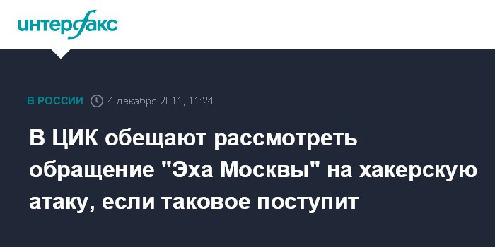 Москва. 4 декабря. INTERFAX.RU - Жалоба "Эхо Москвы" на хакерскую атаку сайта радиостанции в Центризбирком не поступала, но в случае поступления таковой ЦИК ее рассмотрит, сообщил секретарь ведомства Николай Конкин