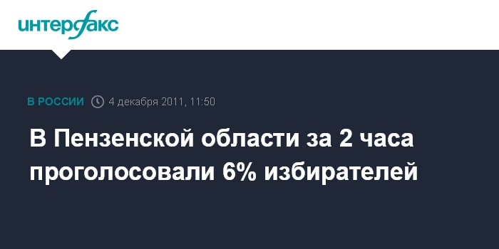 Пенза. 4 декабря. INTERFAX.RU - Активность избирателей Пензенской области ниже, чем на выборах Госдумы 2007 года. "По данным на 10:00 в области проголосовали 6% избирателей", - сообщили агентству "Интерфакс-Поволжье" в облизбиркоме.