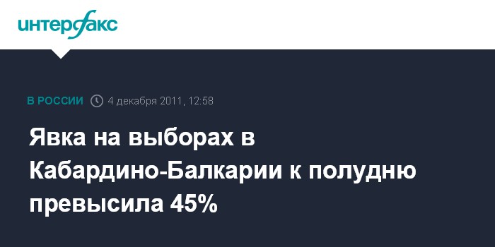 Нальчик. 4 декабря. INTERFAX.RU - На выборах в Кабардино-Балкарии на 12:00 проголосовали 46% избирателей, сообщила агентству Интерфакс-Юг заместитель председателя республиканского избиркома Ирина Атмурзаева. "Лидирует Терский район КБР, где проголосовали уже более 60% избирателей", - отметила И.Атмурзаева.