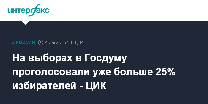 Москва. 4 декабря. INTERFAX.RU - Явка избирателей на выборах в Госдуму РФ шестого созыва, по данным на 13:00 мск, составила 25,4%, сообщил замглавы Центризбиркома РФ Леонид Ивлев. "По состоянию на 13:00 московского времени, 25,4% избирателей, включенных в списки, приняли участие в голосовании и пришли на избирательные участки", - сказал он в Центризбиркоме в воскресенье.