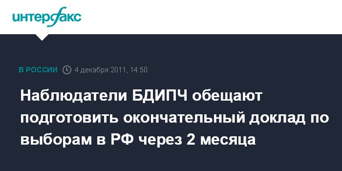 "Наши наблюдатели останутся в России после дня голосования еще примерно на 10 дней для оценки остающейся стадии избирательного процесса, включая жалобы. Спустя два месяца после голосования мы подготовим окончательный доклад с рекомендациями для российских властей", - сказал журналистам директор БДИПЧ ОБСЕ Ян Ленартич, посетивший избирательный участок номер 148 в музее музыкальной культуры имени Глинки в воскресенье.