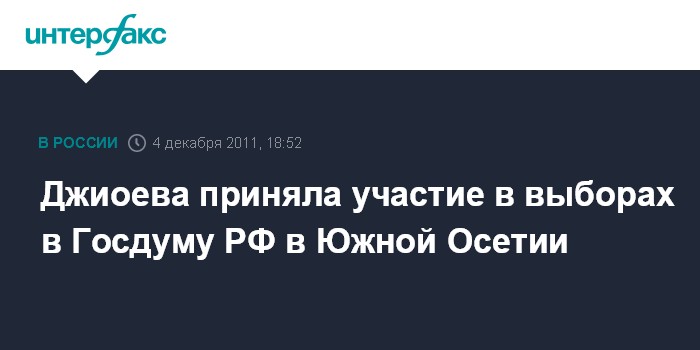 Цхинвали. 4 декабря. INTERFAX.RU - Экс-кандидат в президенты Южной Осетии от оппозиции Алла Джиоева проголосовала на выборах депутатов Госдумы России в Цхинвали, сообщил "Интерфаксу" консул посольства России в Южной Осетии Тамерлан Зассеев. "Алла Алексеевна проголосовала на избирательном участке в консульском отделе посольства России около 15 минут назад", - отметил он.