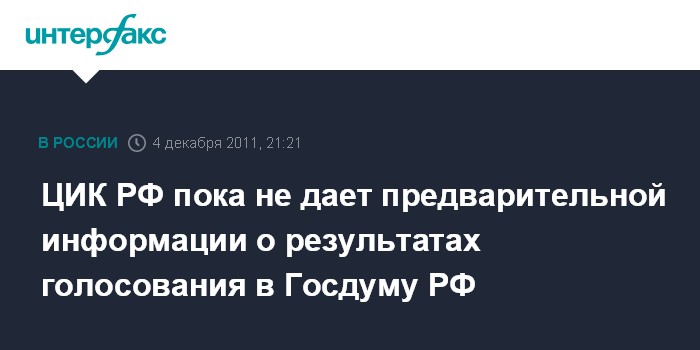 Москва. 4 декабря. INTERFAX.RU - ЦИК РФ задерживает сообщение о предварительной информации о результатах голосования в Госдуму РФ.