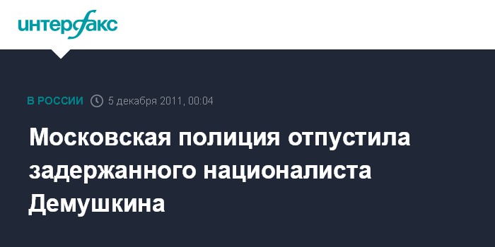 Москва. 4 декабря. INTERFAX.RU - Лидера националистов Дмитрия Демушкина отпустили из ОВД в Москве, куда он был доставлен с площади Революции.