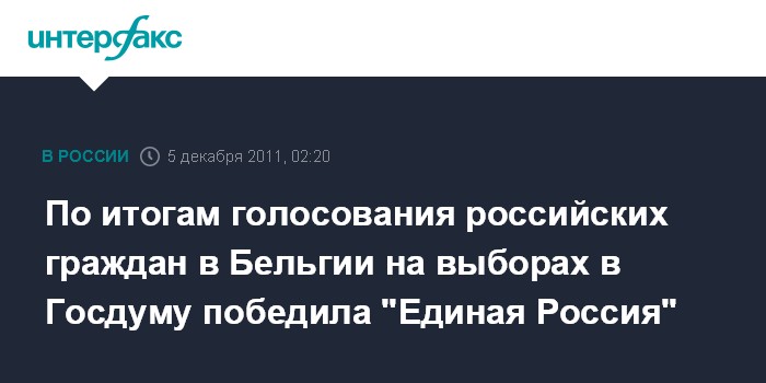 Брюссель. 5 декабря. INTERFAX.RU - "Единая Россия" побеждает по количеству голосов, отданных ей на выборах в Госдуму среди россиян, живущих в Бельгии, сообщает корреспондент "Интерфакса".