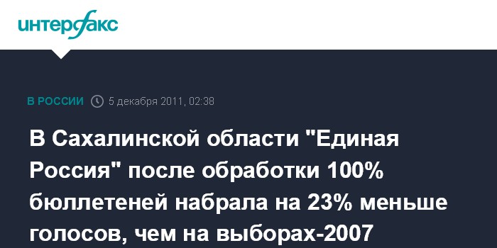 В Сахалинской области "Единая Россия" после обработки 100% бюллетеней набрала на 23% меньше голосов, чем на выборах-2007