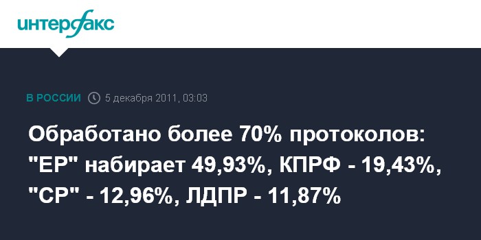 Москва. 5 декабря. INTERFAX.RU - По предварительной информации, после обработки 70,36% протоколов "Единая Россия" набирает 49,93% голосов, КПРФ - 19,43%, "Справедливая Россия" - 12,97%, ЛДПР - 11,87%.