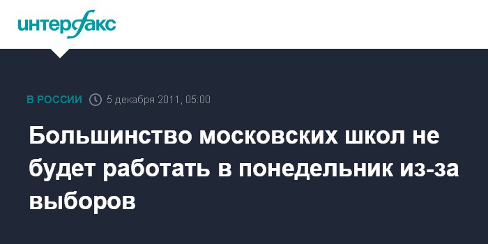 Москва. 5 декабря. INTERFAX.RU - В связи с организацией в образовательных учреждениях мест голосования по выборам депутатов Госдумы РФ шестого созыва в понедельник в большинстве московских школ будет выходной, сообщили "Интерфаксу" в департаменте образования столицы.