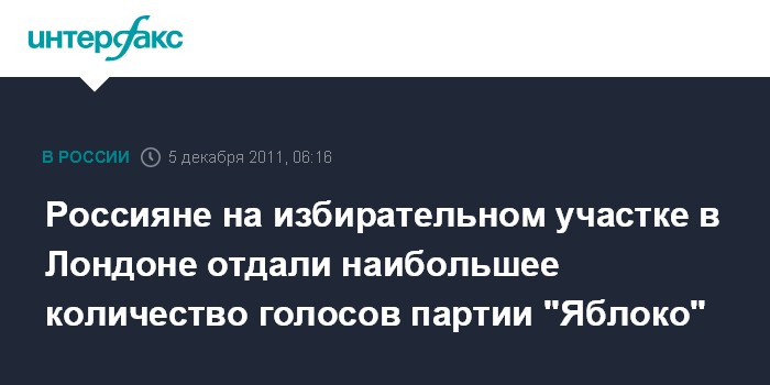 Лондон. 5 декабря. INTERFAX.RU - Партия "Яблоко" набрала наибольшее число голосов среди избирателей в посольстве России в Великобритании, сообщили "Интерфаксу" в пресс-службе российского диппредставительства в понедельник.