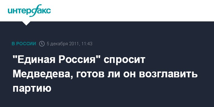 Москва. 5 декабря. INTERFAX.RU - Руководство "Единой России" в ближайшее время намерено поинтересоваться у президента РФ Дмитрия Медведева, готов ли он стать во главе партии.