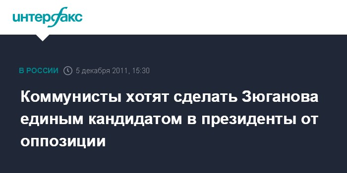 Москва. 5 декабря. INTERFAX.RU - КПРФ призывает все оппозиционные партии поддержать ее лидера Геннадия Зюганова на выборах президента России.