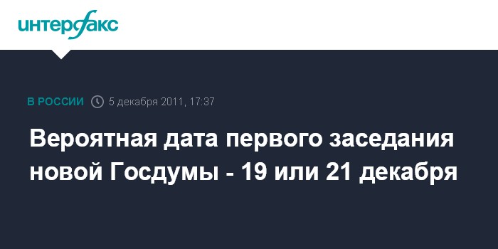 Москва. 5 декабря. INTERFAX.RU - Первое заседание Госдумы шестого созыва может состояться 19 или 21 декабря, сообщил "Интерфаксу" в понедельник глава думского комитета по регламенту и организации работы палаты Отари Аршба.