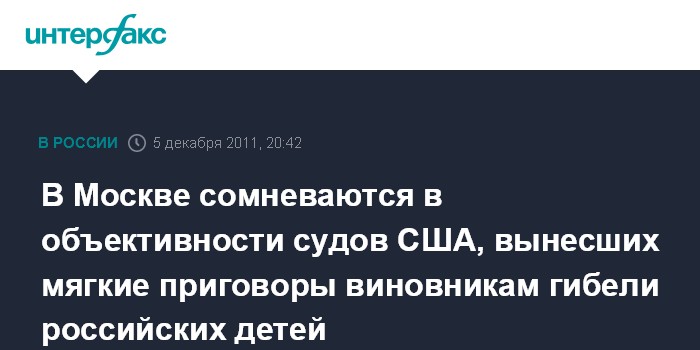 Москва. 5 декабря. INTERFAX.RU - Необоснованно мягкие вердикты в отношении людей, виновных в гибели детей из России, ставят под сомнение объективность судебной системы США, считают в МИД РФ.