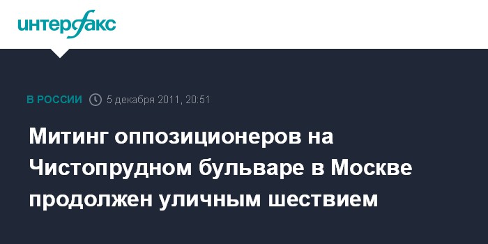 Москва. 5 декабря. INTERFAX.RU - Часть участников акции оппозиции на Чистопрудном бульваре покинули место проведения согласованной с властями акции и устроили шествие, передает корреспондент "Интерфакса".