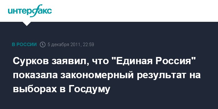 Москва. 5 декабря. INTERFAX.RU - Первый замглавы администрации президента РФ Владислав Сурков считает закономерным результат "Единой России" на состоявшихся думских выборах.