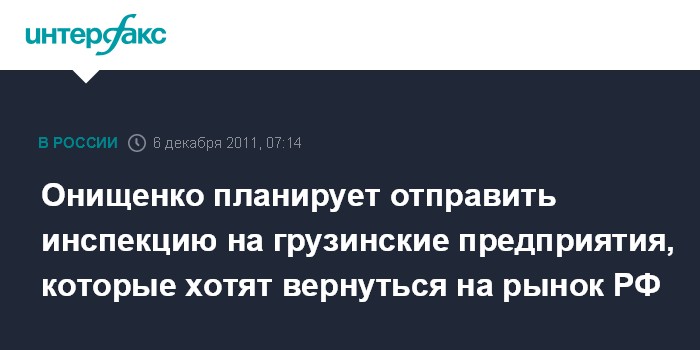 Ранее Г.Онищенко сказал "Интерфаксу", что при желании грузинский бизнес может начать поставки вина и минеральной воды в РФ до конца 2011 года, если пройдет процедуру допуска.