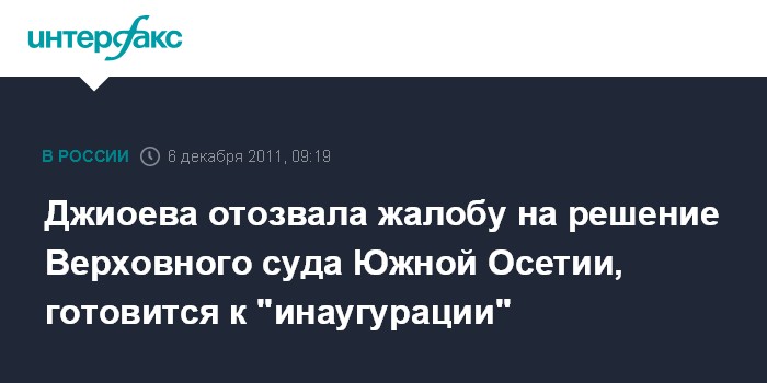 Цхинвал. 6 декабря. INTERFAX.RU - Экс-кандидат в президенты Южной Осетии от оппозиции Алла Джиоева отозвала жалобу на решение Верховного суда республики, отменившего результаты президентских выборов.