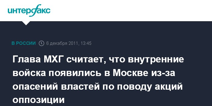 "Ненормальная и очень тревожная ситуация. Она тревожит и нас, и власть. Видимо, панически боятся выступлений на улицах после выборов", - сказала Алексеева "Интерфаксу" во вторник. "Ничего себе! Начало работы нового парламента, а они войска вводят. Власти, видимо, боятся тех, кто должен быть электоратом, и того, кто должен быть единственным источником власти в стране, - многонациональный российский народ", - сказала глава МХГ.