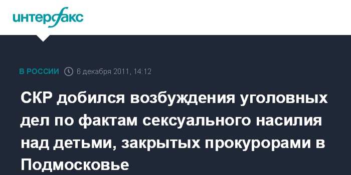 Москва. 6 декабря. INTERFAX.RU - Следственный комитет России опротестовал решения прокуроров, отменивших возбуждение уголовных дел, связанных с сексуальным насилием в отношении несовершеннолетних, сообщила "Интерфаксу" официальный представитель подмосковного управления СКР Ирина Гуменная.