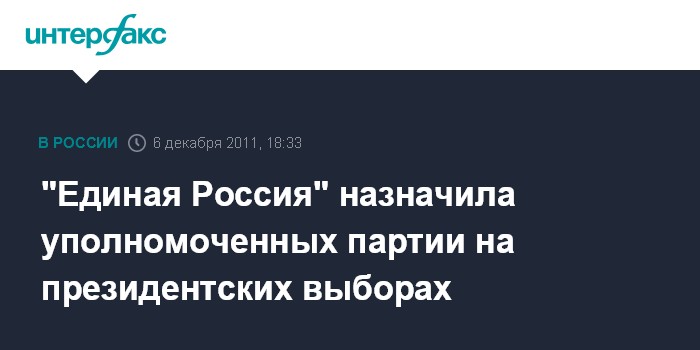 "Сегодня президиум Генерального совета партии "Единая Россия" на основании решения 12-го съезда и в соответствии с Уставом назначил уполномоченных представителей партии "Единая Россия" для представления ее по всем вопросам, связанным с участием в выборах президента РФ (в марте 2012 года - ИФ)", - цитирует во вторник секретаря президиума Генсовета "единороссов" Сергея Неверова пресс-служба партии.