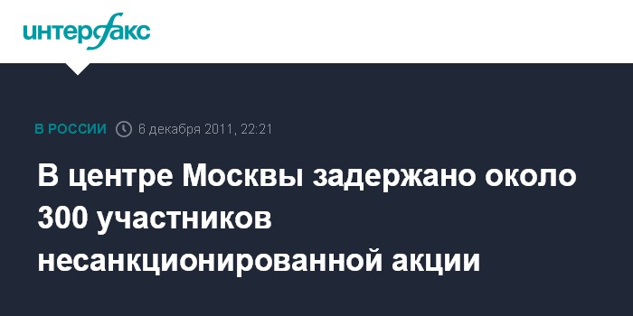Москва. 6 декабря. INTERFAX.RU - Около 300 человек задержаны за участие в несанкционированной массовой акции в центре столицы, сообщили "Интерфаксу" в пресс-службе Главного управления МВД РФ по Москве вечером во вторник.