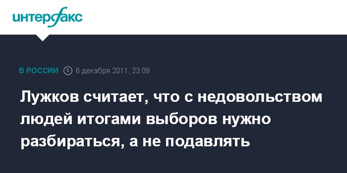 Отвечая на вопрос о протестах горожан после выборов, Юрий Лужков сказал: "Есть довольно много тех, кто считает выборы нелегитимными, что неправильно сделаны подсчеты, поэтому выходят на улицы, площади, выражают отношение к результатам. "Протесты по результатам выборов были всегда. Кто-то считает, что его партия получила меньше, чем проголосовали", - сказал Лужков.
