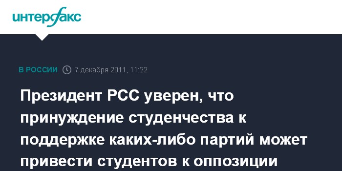 В то же время в МАИ "Интерфаксу" ответил, что такая ситуация невозможна. "Такого не могло быть вообще, я не в курсе этой проблемы", - заявил помощник проректора по внеучебной работе Андрей Равин, отвечая на вопрос, действительно ли студентов принуждали поддерживать какие-либо партии под угрозой отчисления. "У нас студенты занимаются делом, тем более сейчас сессии, поэтому не до политики сейчас. В интернете очень много всего появляется и неизвестно кто это разводит", - подчеркнул он.