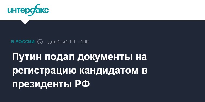 Москва.7 декабря. INTERFAX.RU - Премьер-министр РФ Владимир Путин подал документы на регистрацию в качестве кандидата в президенты РФ в рабочую группу ЦИК России.