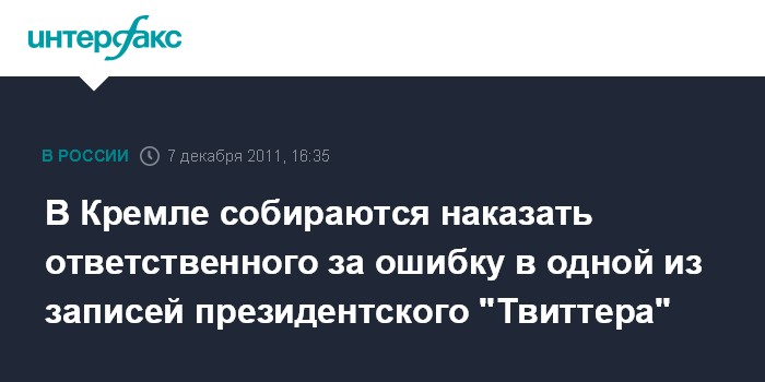 Москва. 7 декабря. INTERFAX.RU - В Кремле назвали ошибкой появление в "Твиттере" президента РФ Дмитрия Медведева некорректного ретвита одной из записей пользователя, подчеркивая, что виновные будут наказаны.