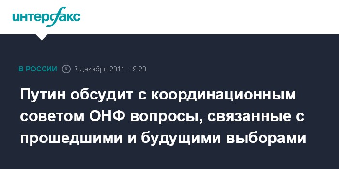 Москва. 7 декабря. INTERFAX.RU - Премьер-министр РФ Владимир Путин в четверг примет участие в заседании координационного совета Общероссийского народного фронта (ОНФ), где будут обсуждаться итоги прошедших парламентских выборов, а также планы предстоящей работы на выборах президента России.
