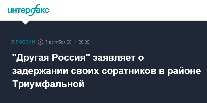 Москва. 7 декабря. INTERFAX.RU - В оппозиции заявляют, что группа активистов незарегистрированной партии "Другая Россия" задержана в среду вечером в Москве в районе Триумфальной площади.