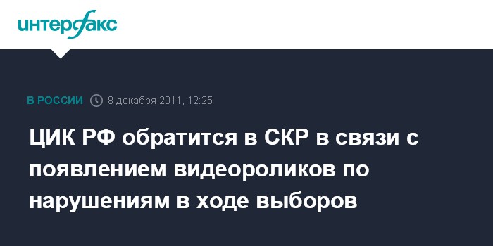 Москва. 8 декабря. INTERFAX.RU - Центризбирком РФ в ближайшее время обратится в Следственный комитет РФ и другие правоохранительные органы в связи с появлением в Интернете фото- и видеороликов по нарушениям в ходе избирательной кампании, сообщил глава ЦИК РФ Владимир Чуров.