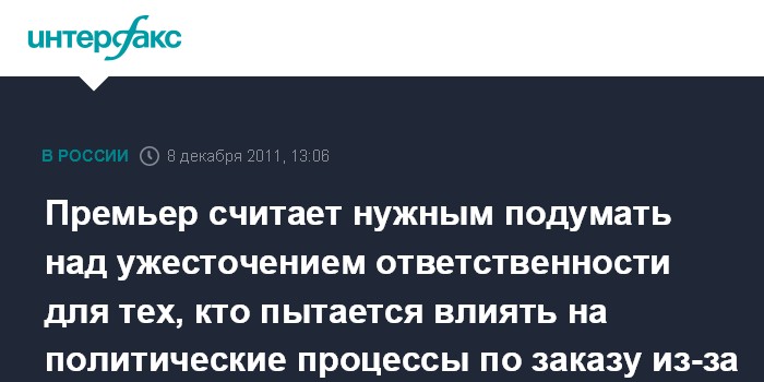 Москва. 8 декабря. INTERFAX.RU - Премьер-министр РФ Владимир Путин высказался за усиление ответственности для тех, кто по заказу иностранных государств пытается вмешаться во внутренние процессы в России. Об этом он объявил на встрече с участниками федерального координационного совета Общероссийского народного фронта.