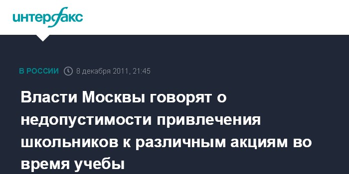Москва. 8 декабря. INTERFAX.RU - Учащихся недопустимо привлекать к участию в разного рода публичных мероприятиях в учебное время. Это следует из распоряжения, подписанного главой департамента образования Москвы Исааком Калиной.