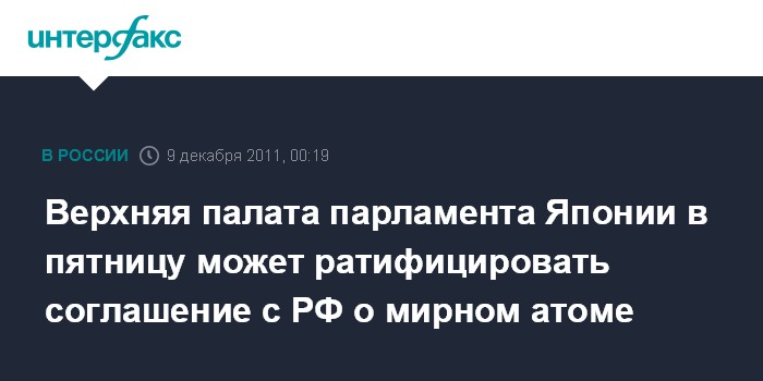 Москва. 9 декабря. ИНТЕРФАКС - Верхняя палата парламента Японии в пятницу может ратифицировать соглашение с РФ о мирном атоме.