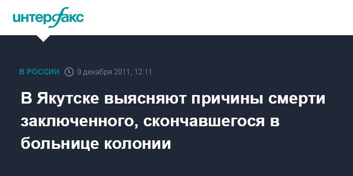 Якутск. 9 декабря. INTERFAX.RU - В центральной больнице якутской исправительной колонии №7 скончался заключенный, отбывавший срок за кражу, сообщила уполномоченный по правам человека Якутии Федора Захарова агентству "Интерфакс - Дальний Восток" в пятницу.