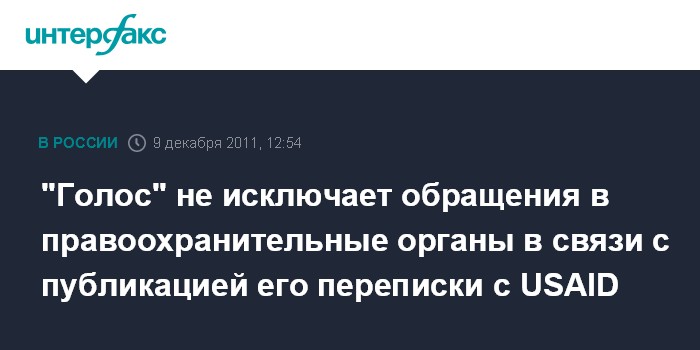 Москва. 9 декабря. INTERFAX.RU - Ассоциация в защиту прав избирателей "Голос" намерена обратиться в правоохранительные органы по поводу публикации переписки членов ассоциации с Агентством США по международному развитию (USAID).