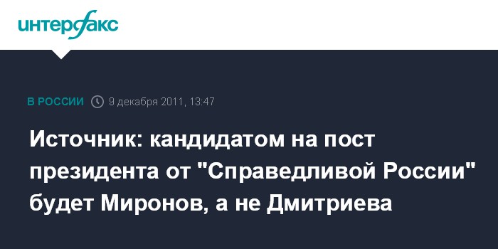 "Сообщения СМИ по поводу того, что кандидатом от нашей партии может быть выдвинута Оксана Дмитриева, не соответствуют действительности. Съезд выдвинет в субботу кандидатом на президентский пост нашего лидера Сергея Миронова", - сказал источник.