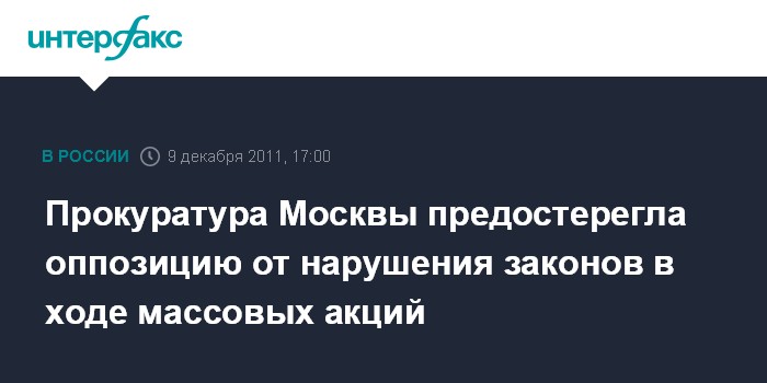 Москва. 9 декабря. INTERFAX.RU - Прокуратура Москвы предупредила активистов оппозиционных движений и организаций о недопустимости нарушений закона.